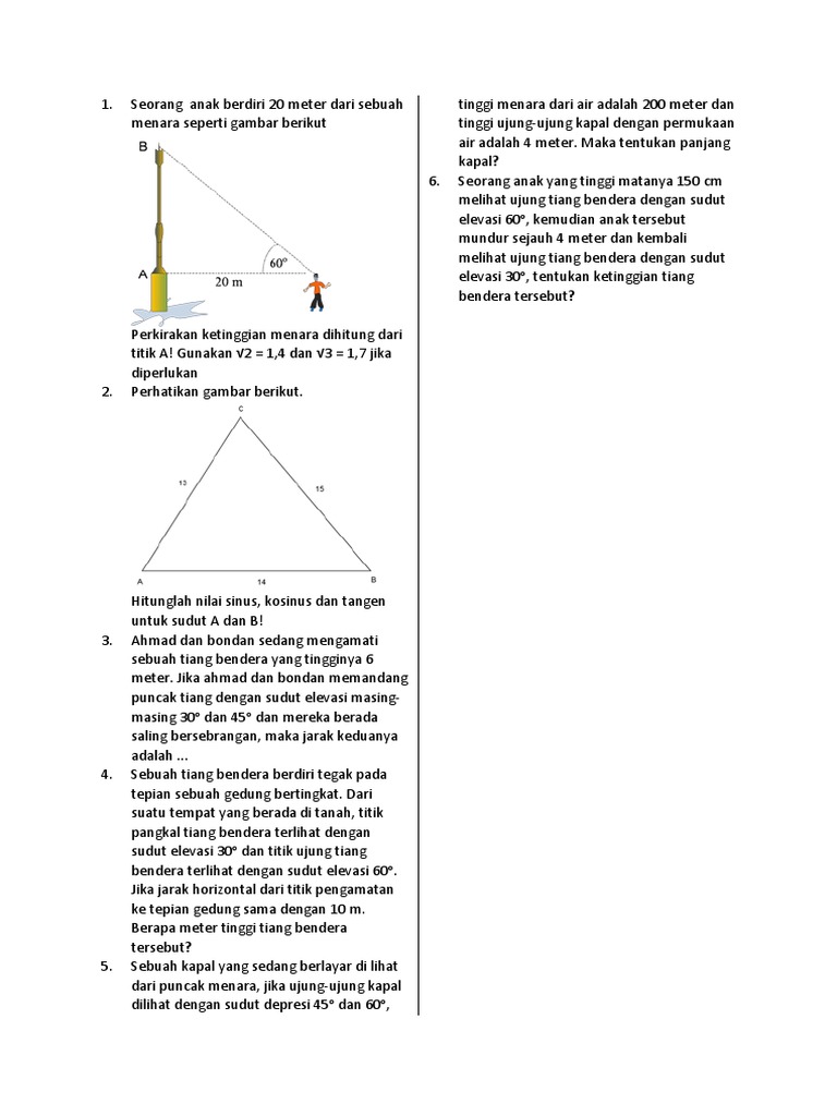 Andri Akan Mengukur Ting Descubre Como Resolverlo En Qanda from thumb-m.mathpresso.io # satuan sudut derajat (xo) # satuan sudut radian (p) 1. Jika tinggi merkusuar adalah 85 m dari permukaan laut, tentukan jarak antara kedua perahu tersebut. Aturan cosinus contoh 1 : 20140531 15 nomor contoh soal sudut elevasi dan depresi soal cerita beserta pembahasannyasudut elevasi adalah sudut yang dibentuk jika kita melihat ke atas terhadap garis mendatar horizontal. $ spadesuit $ sudut depresi adalah sudut yang dibentuk oleh arah horizontal dengan arah pandangan mata pengamat ke arah bawah. Besarnya sudut elevasi dan depresi sama besar seperti gambar berikut, contoh : Sebuah gedung yang tingginya 50 m dan terdapat sebuah bola di dekat gedung. Dari puncak sebuah gedung 200 meter tinggi, sudut depresi untuk bagian bawah bangunan kedua adalah 20 derajat.